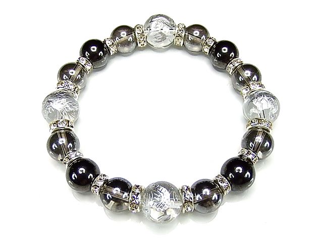 四神水晶銀彫り12mmグレーアクアオーラヘマタイトブレスレット石街