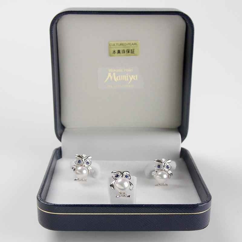 お洒落好きの方へフクロウのSV高級カフス。7ミリパールとサファイアの目がポイント。話題性抜群のプレゼントに【あこや真珠】