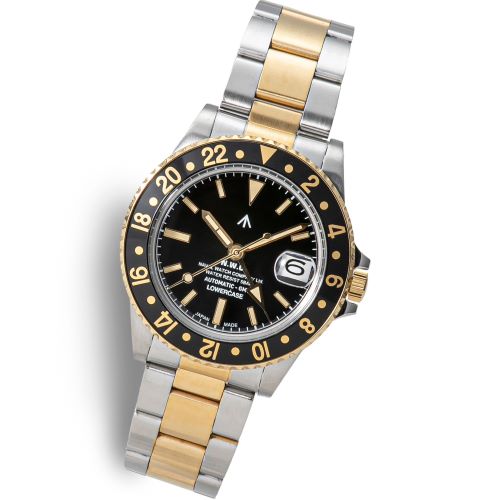 ナバルウォッチ・ロウワーケース・GMTタイプ・3連メタルブレス・ブラックフェイス・SV/GDコンビモデル。