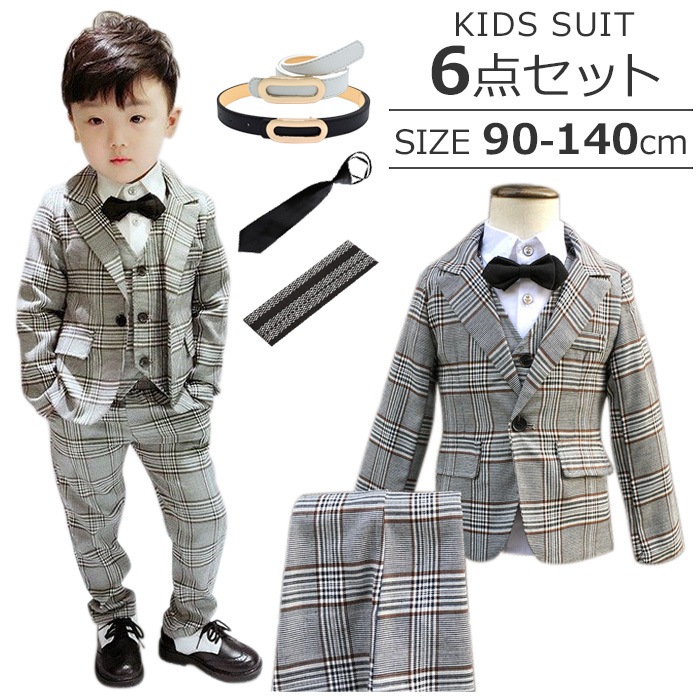 正午まで当日発送(土日祝除く) 男の子 子供スーツ 6点セット 男の子 フォーマル[3ピース スーツセット グレー チェック柄]格...