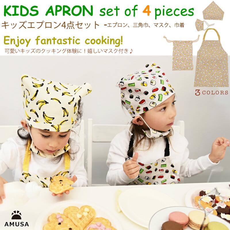 キッズエプロン4点セット 三角巾 マスク 収納袋 キッズ ベビー 男の子 女の子 幼稚園 保育園 小学校 料理教室 クッキング ス...