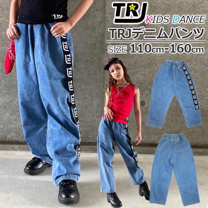 TRJオリジナル★ロゴテープ デニムパンツ ハイウェスト 女の子 男の子 子供服 キッズ ジーンズ 無地 ロゴ ワイドパンツ 11...