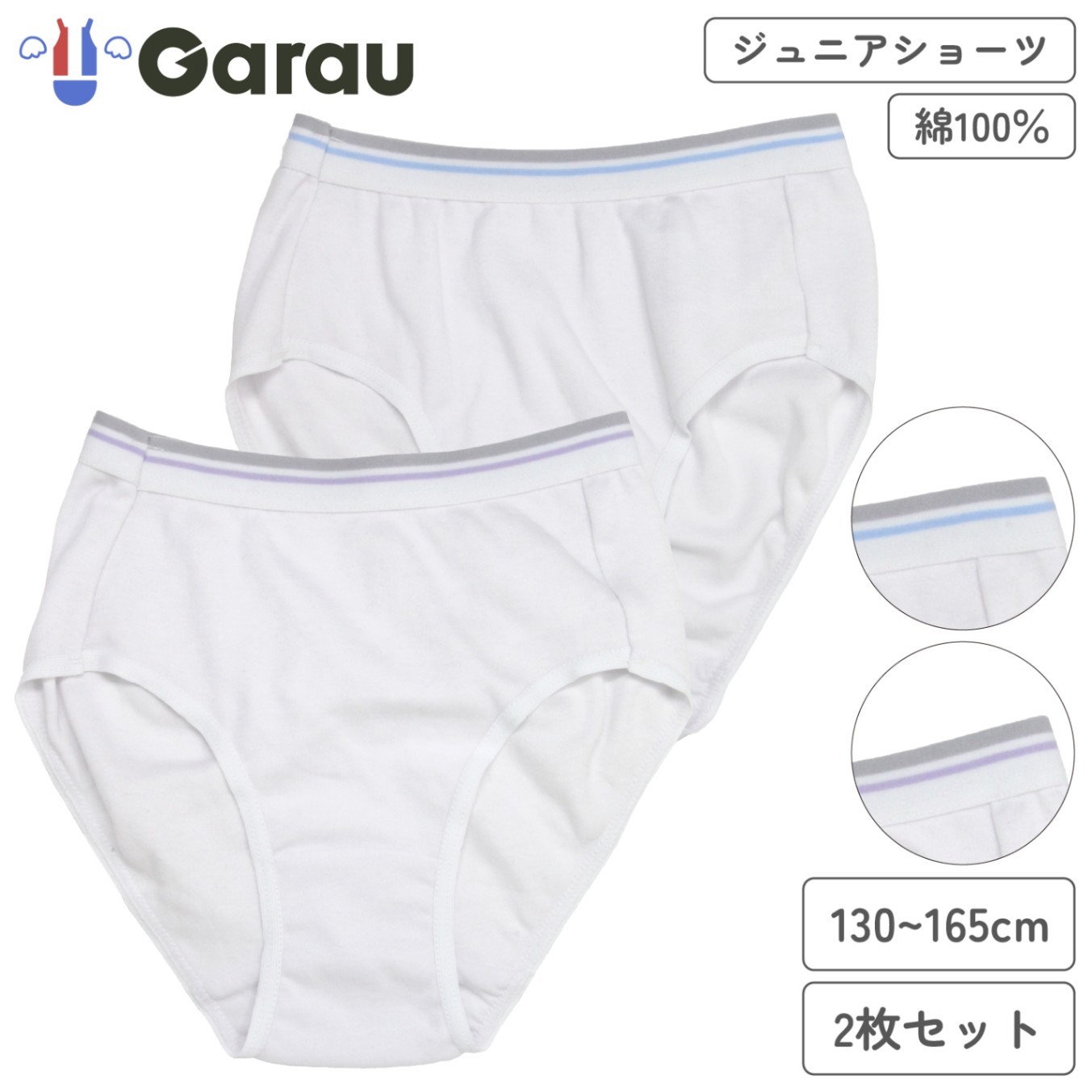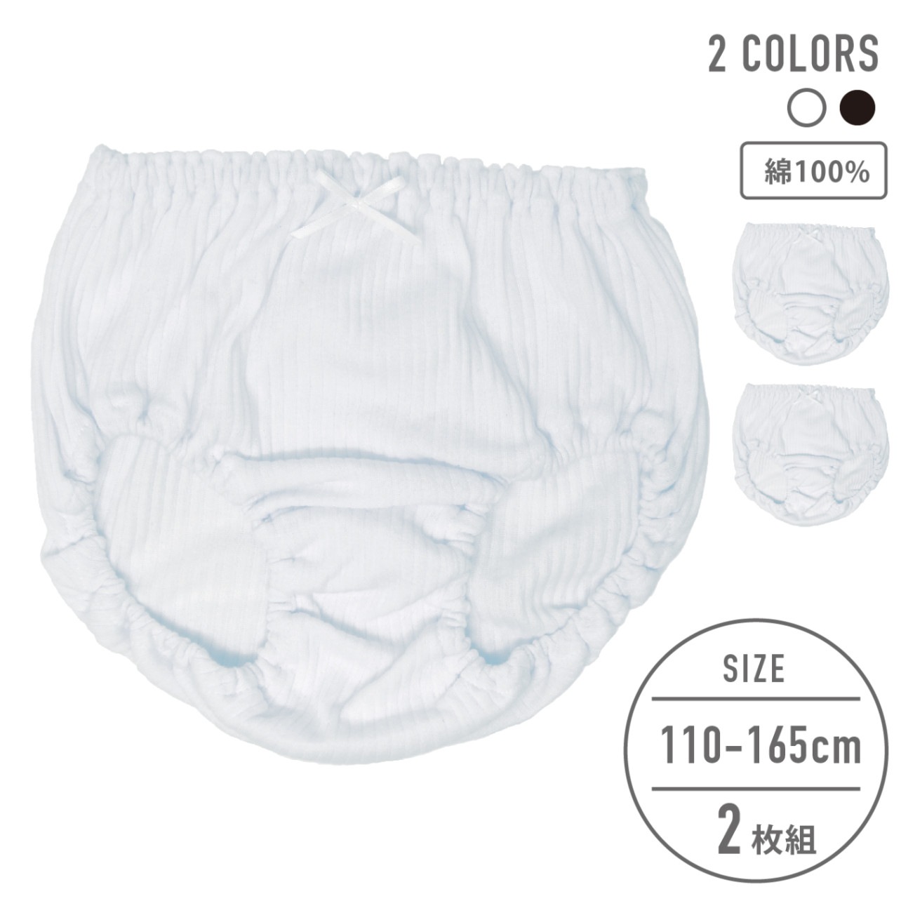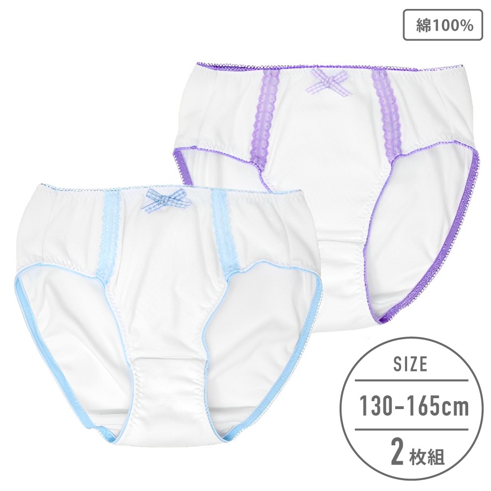 【女の子】【下着】キッズジュニア 白ショーツ 2枚組 リブ無地/リボン付き 100~165cm【綿100%】