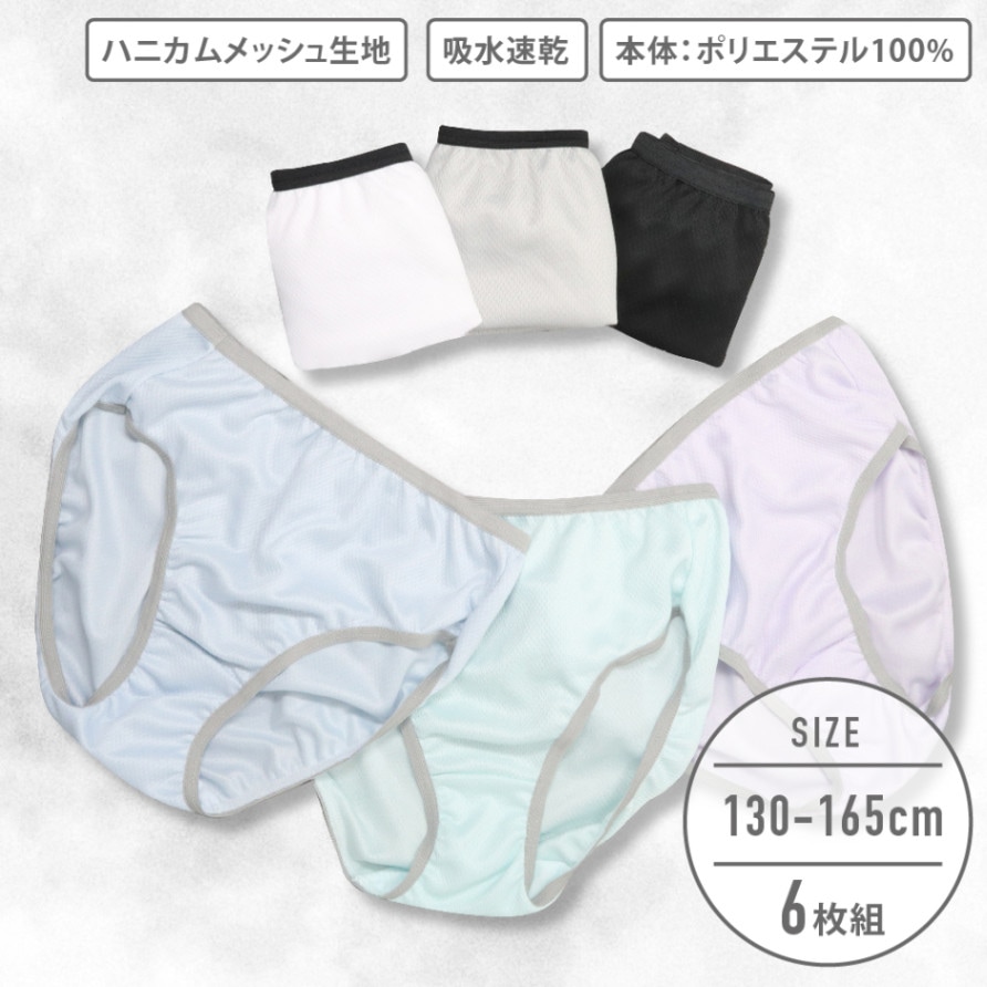 【女の子】ジュニアショーツ 6枚組 くすみパステル&モノトーン無地/ハニカムメッシュ 130~165cm【吸水速乾】