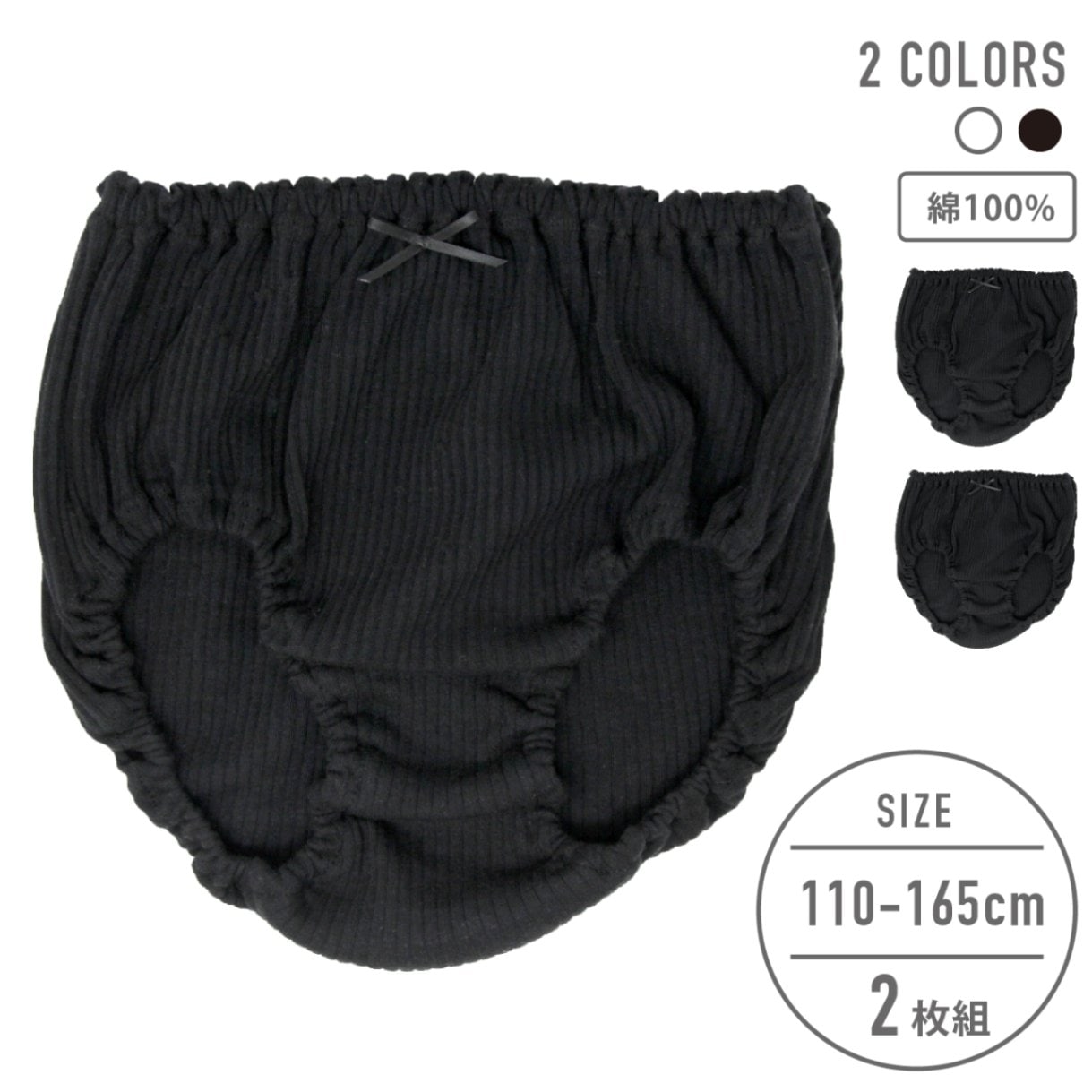 【女の子】【下着】キッズジュニア 黒ショーツ 2枚組 リブ無地/リボン付き 100~165cm【綿100%】