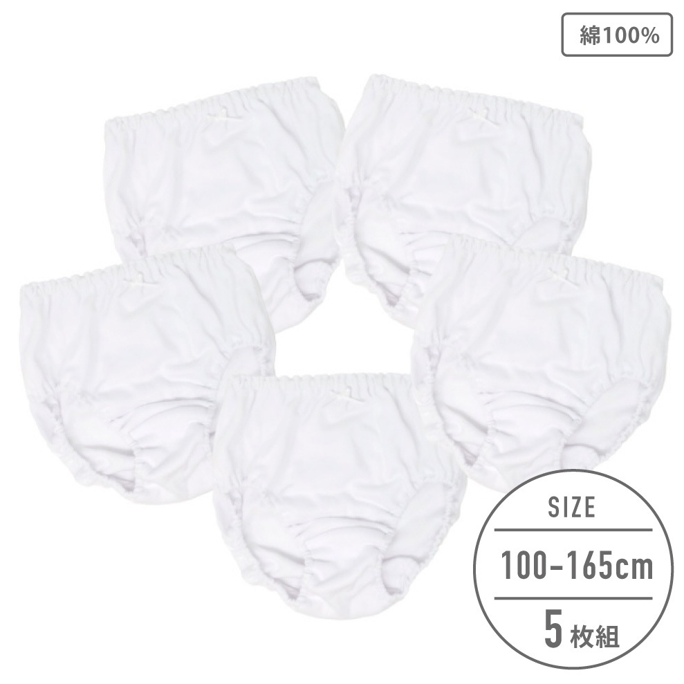 【女の子】まっしろショーツ 5枚組 白/無地 100~165cm【綿100%】