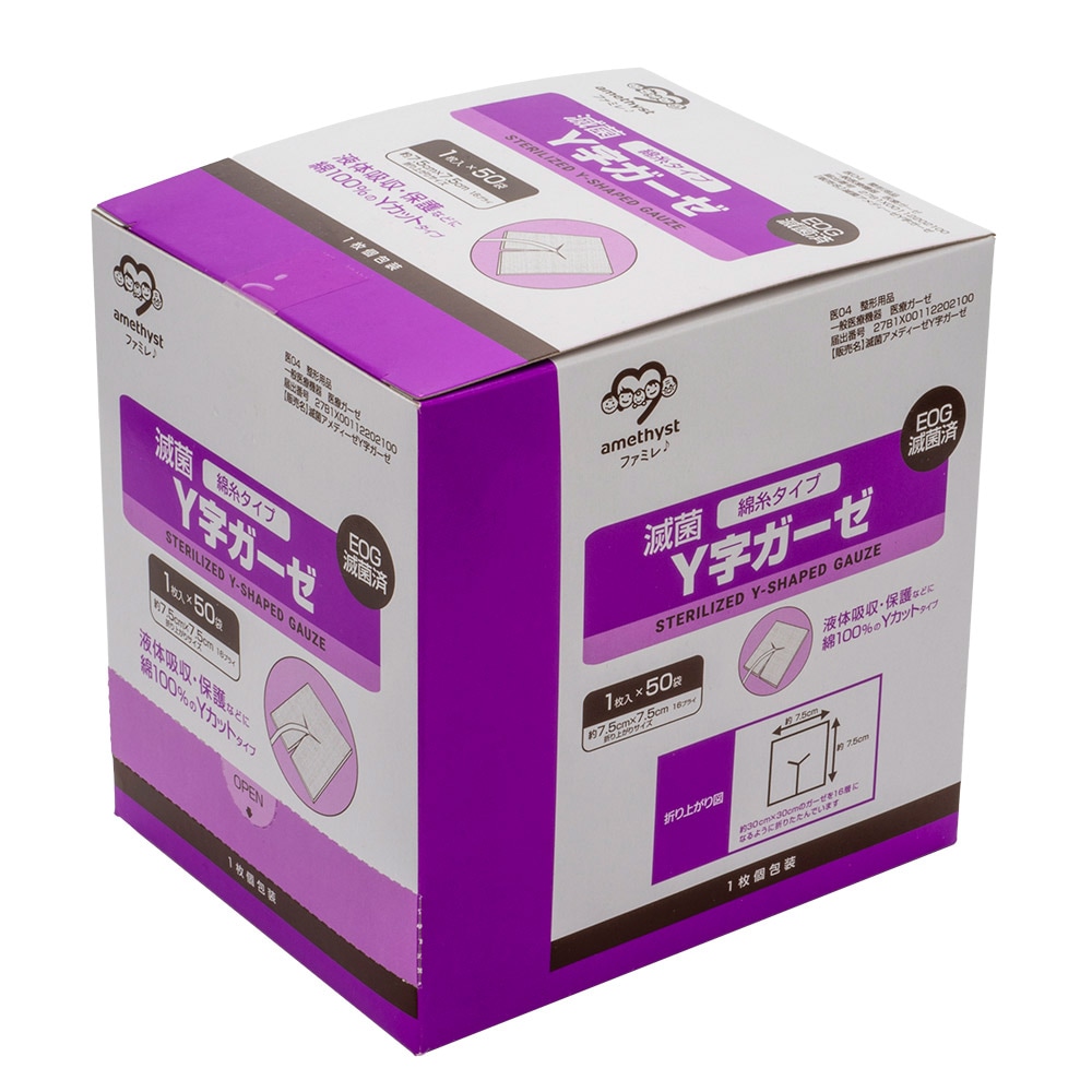 ワンウェイ滅菌Y字ガーゼ(綿糸)7.5×7.5 16ply 50枚入【滅菌ガーゼ】【介護】【大衛】【アメジスト】【病院】【カテーテ...