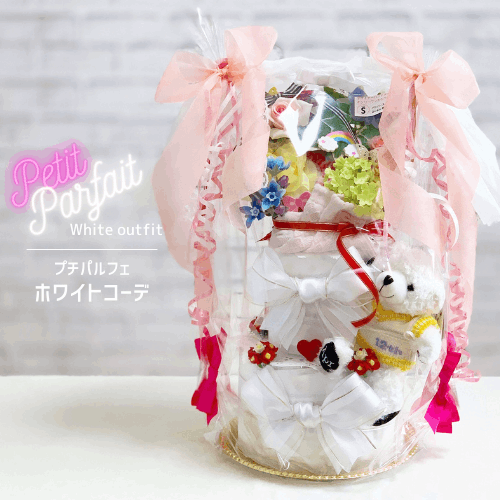 プチサイズ2段 おむつケーキ女の子 プチパルフェ ホワイトコーデ
