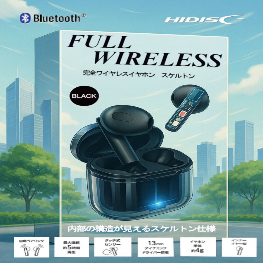 HIDISC ENCマイク搭載 スケルトンフルwirelessイヤフォン ブラック HD-BTCLA06BK