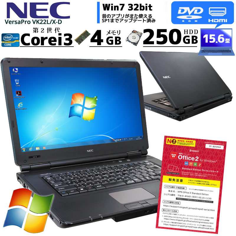 中古ノートパソコン NEC VersaPro VK22L/X-D Windows7 Corei3 2330M メモリ4GB HDD...