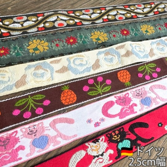 2.2cmから2.8cm幅 ドイツデットストックリボン 細幅チロルテープ 花柄 猫柄 パイナップル柄 チロルテープ 猫モチーフ チ...