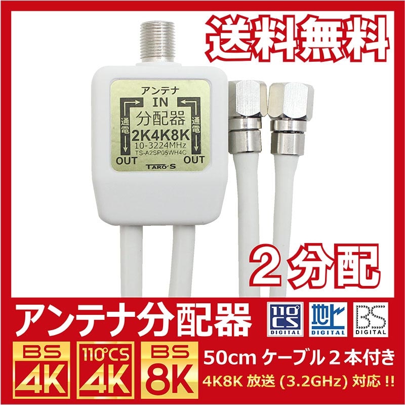【送料無料 ネコポス便】アンテナ分配器 4K8K・地デジ・BS・CS・CATV放送対応 2分配 ケーブル一体型(50cm) 出力側...