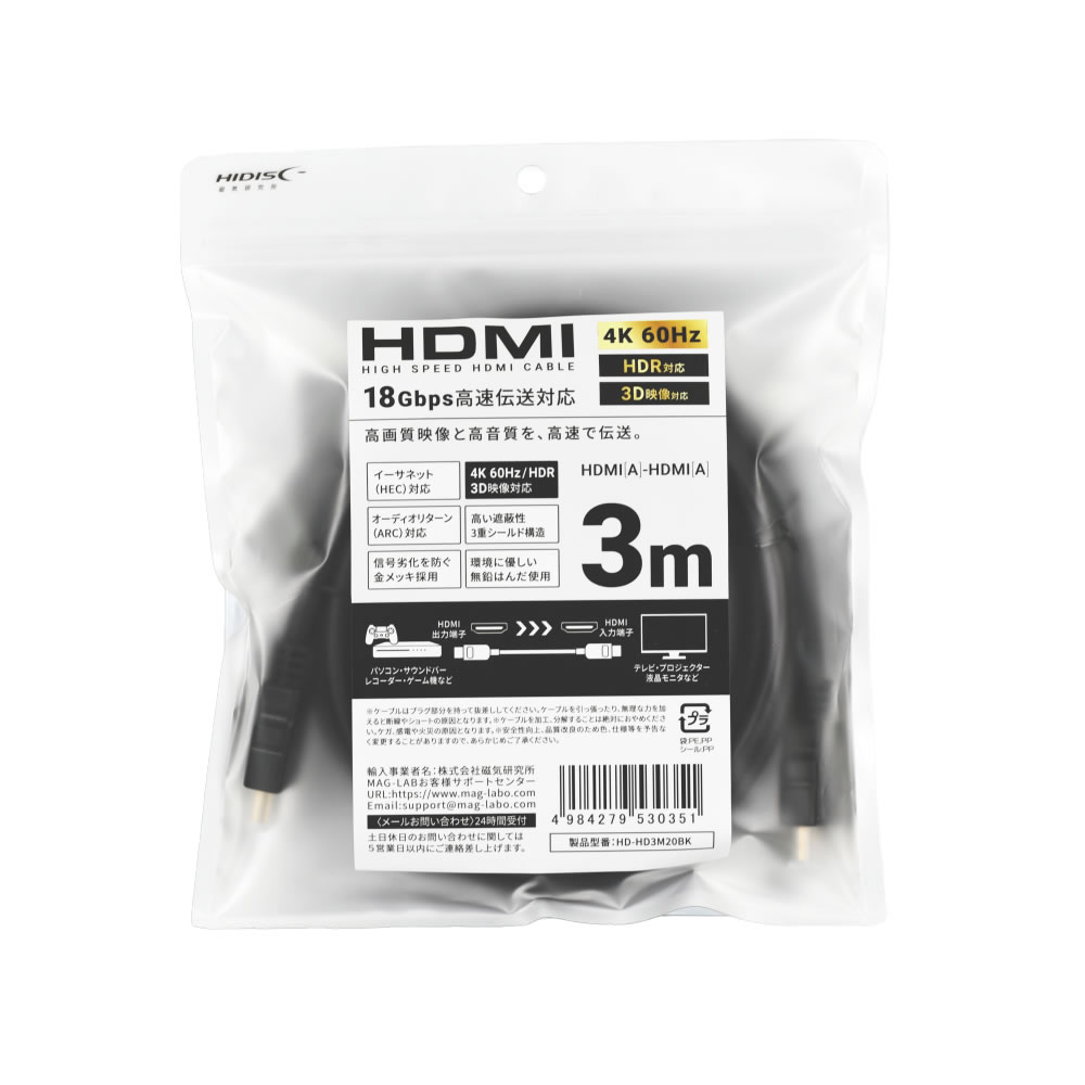 HIDISC HDMIケーブル 3m 4K@60Hz18Gbps 高速伝送対応 HD-HD3M20BK
