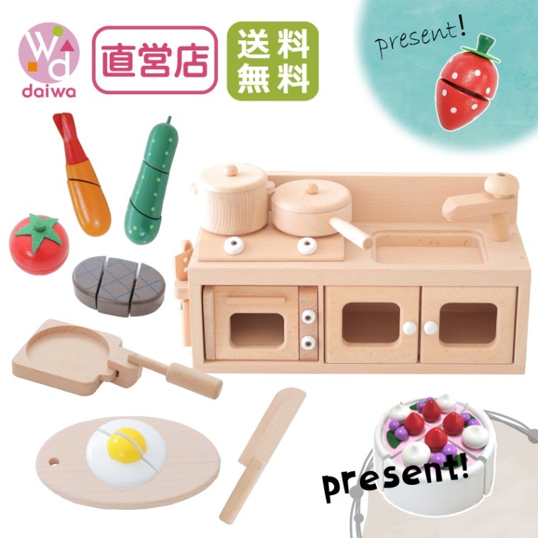 《presentケーキいちご》&《いちご付き》ミニキッチン(白)スタートセット《専用BOX*包装不可》 (木のおもちゃ ままごと)