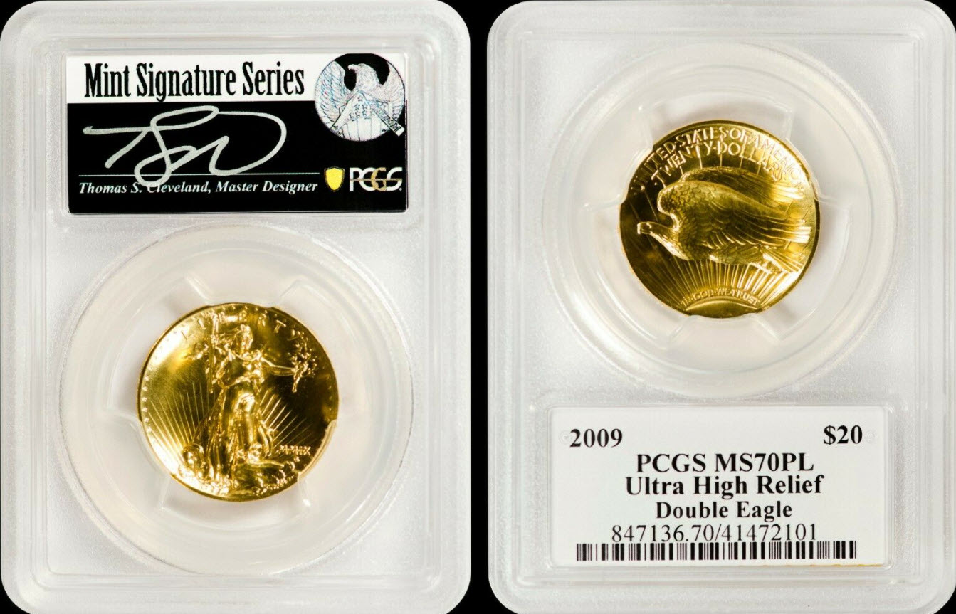 2枚組2009ウルトラハイリリーフ金貨 PCGS-MS70PL(プルーフライク)ジョー・オーランドサイン入り-トーマス・クリーブラ...