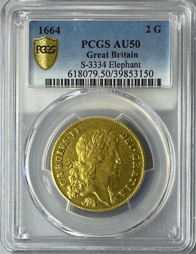 グレートブリテン1664年チャールズ2世金の \"エレファント \"2ギニー1664 PCGS AU50
