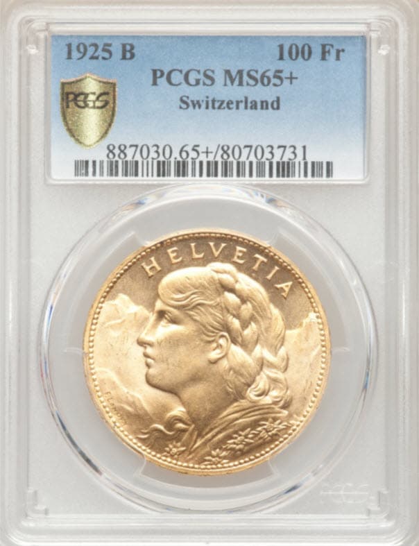 【動画あり】アンティークコイン スイス1925-B年アルプスの少女 ブレネリ100フラン金貨PCGS-MS65+