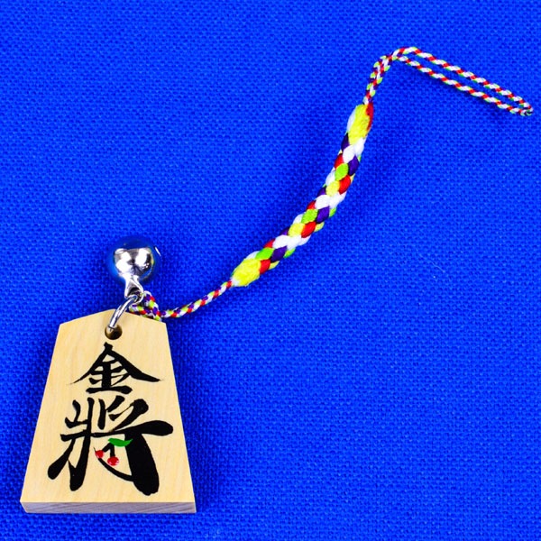 鈴付きの将棋駒ストラップ 金将とさくらんぼ ※将棋駒の高級材御蔵島産本黄楊材 山形県天童市の書き駒師による手書きの将棋駒