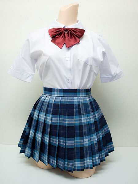 チェックプリーツスカート 青×グレー 日本製◆W60~85/丈30・40cm