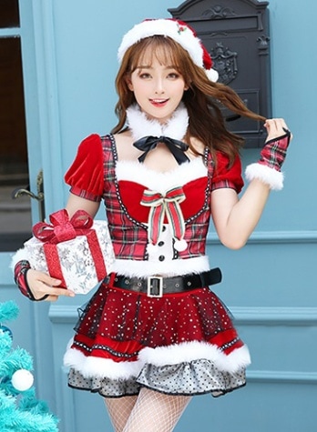 【即日発送】オフショルチェック柄サンタクロース《クリスマスコスプレ7点セット》Malymoon/マリームーン【7552-2】
