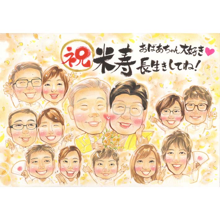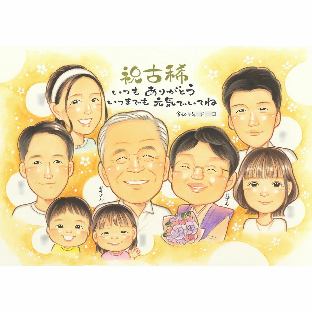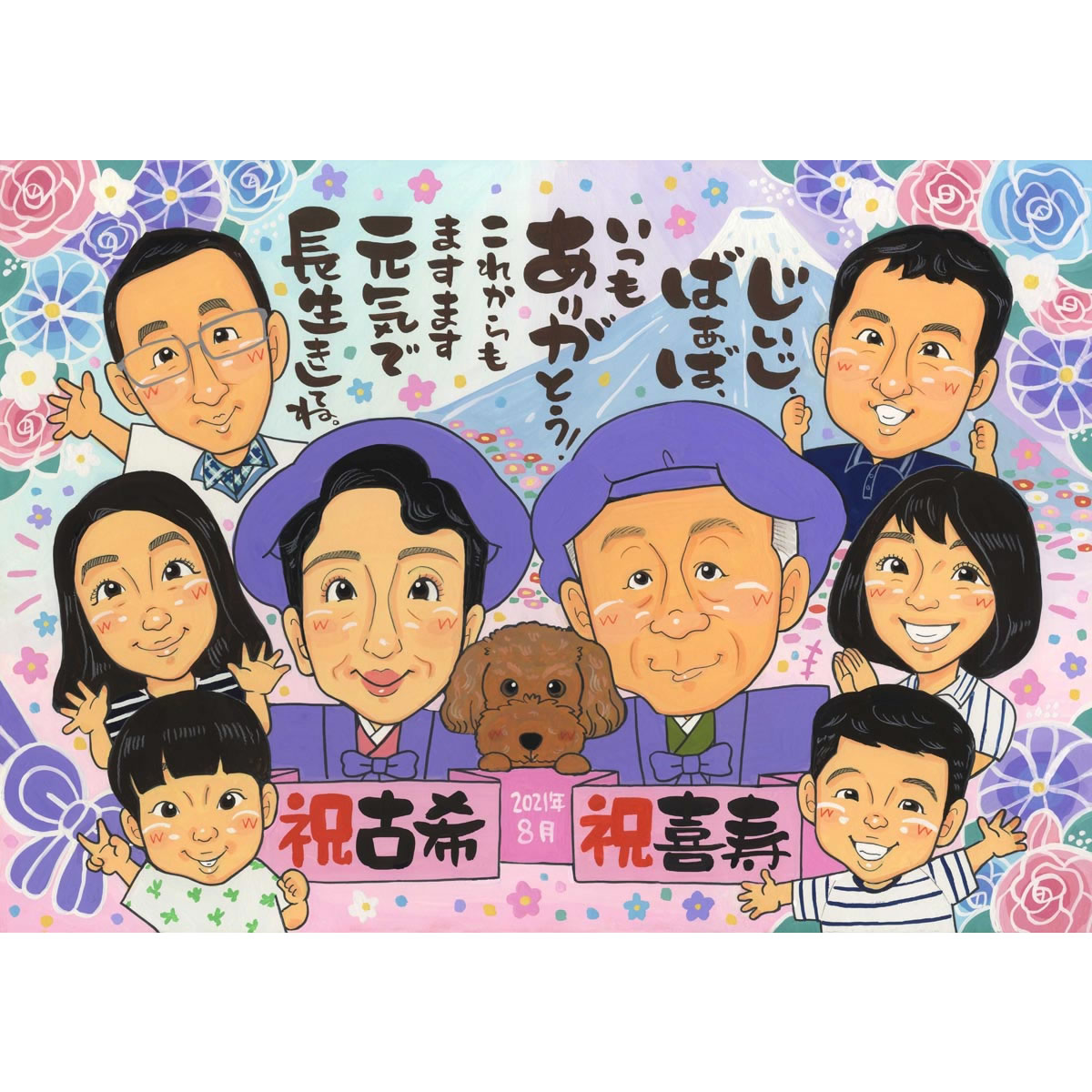 80歳のおばあちゃん、おじいちゃんへの感謝を伝える傘寿似顔絵ギフト 80歳傘寿祝いの思い出に!家族と一緒の似顔絵ギフト