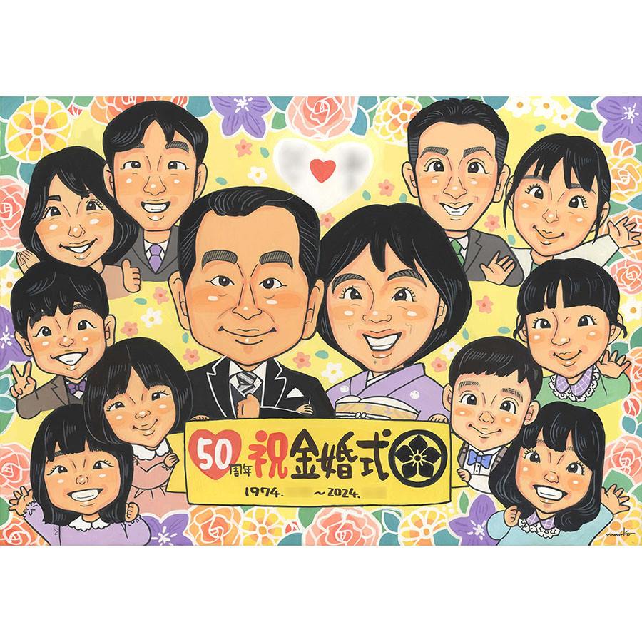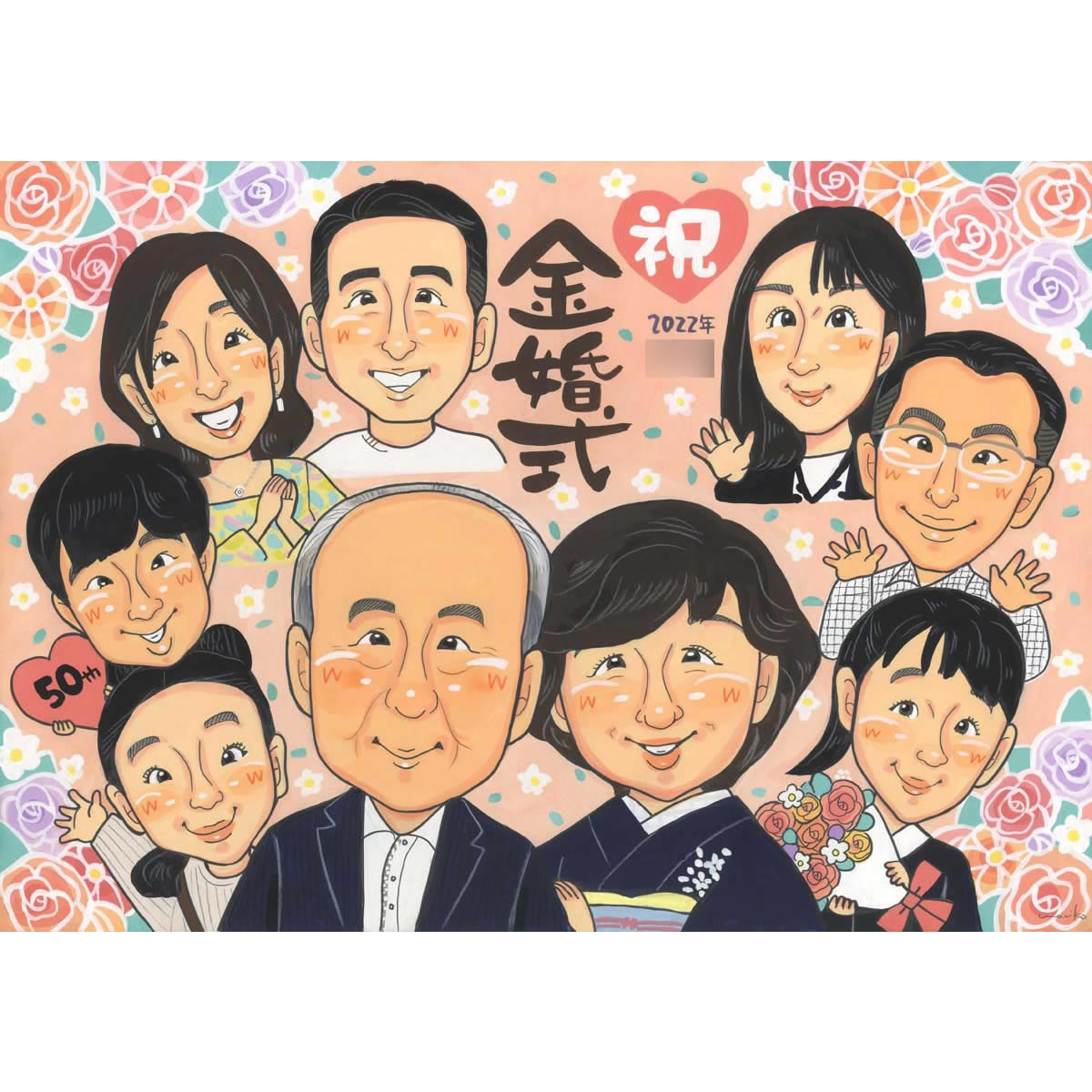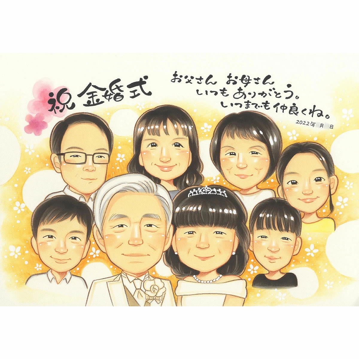 金婚式 50周年 似顔絵 プレゼント 両親への贈り物 感謝の気持ち 家族全員 似顔絵ギフト 大人数 似顔絵ボード 両親ギフト 名入...