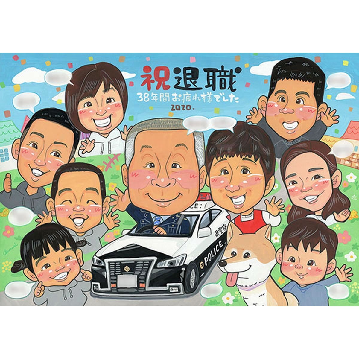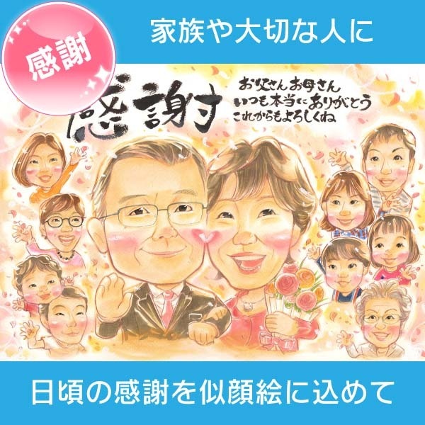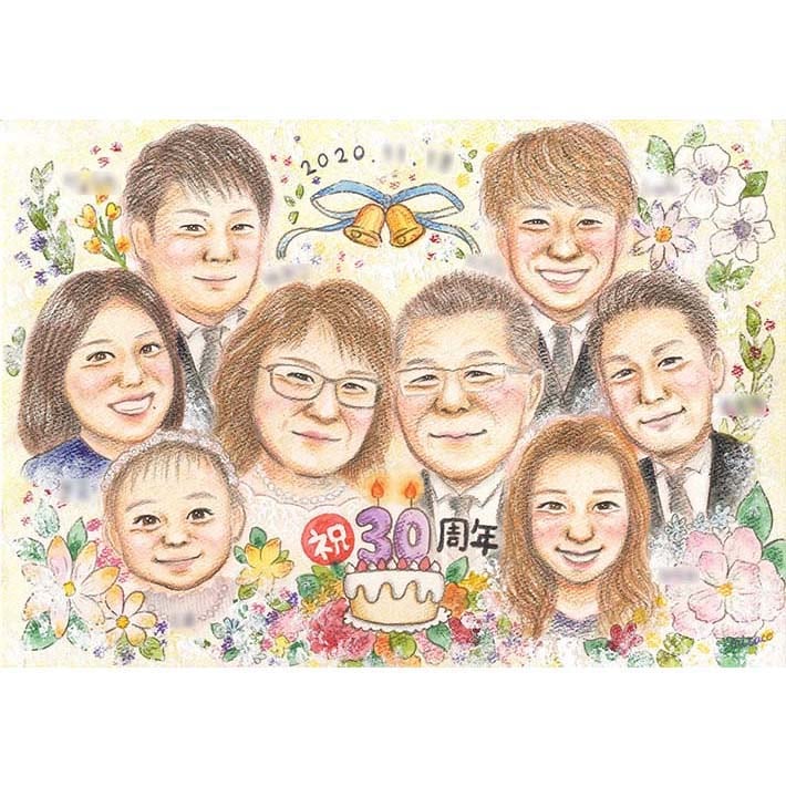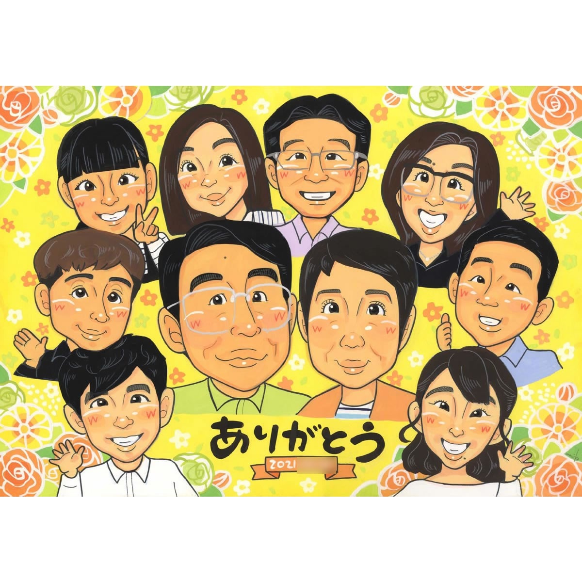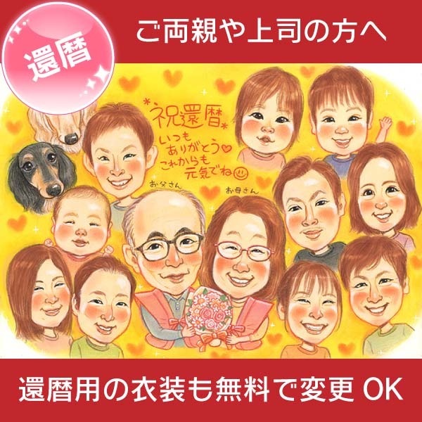 家族全員集合で描く還暦似顔絵ギフト 世代を超える思い出、子供から両親への似顔絵 世界にひとつだけのイラスト色紙ギフト 感謝の気持ち...