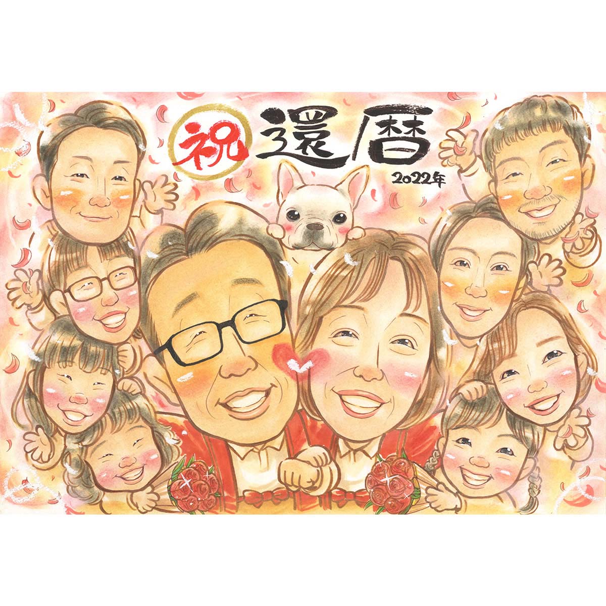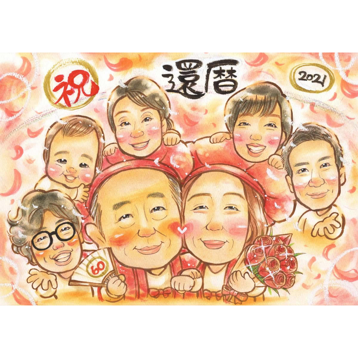 家族全員集合で描く還暦似顔絵ギフト 世代を超える思い出、子供から両親への似顔絵 世界にひとつだけのイラスト色紙ギフト 感謝の気持ち...