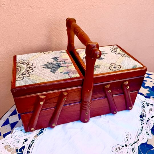 ヨーロッパ買付品1900年初期 レトロデットストック品 ジャガード生地ソーイングボックス 木箱 インテリア雑貨 カゴボックス 裁縫...