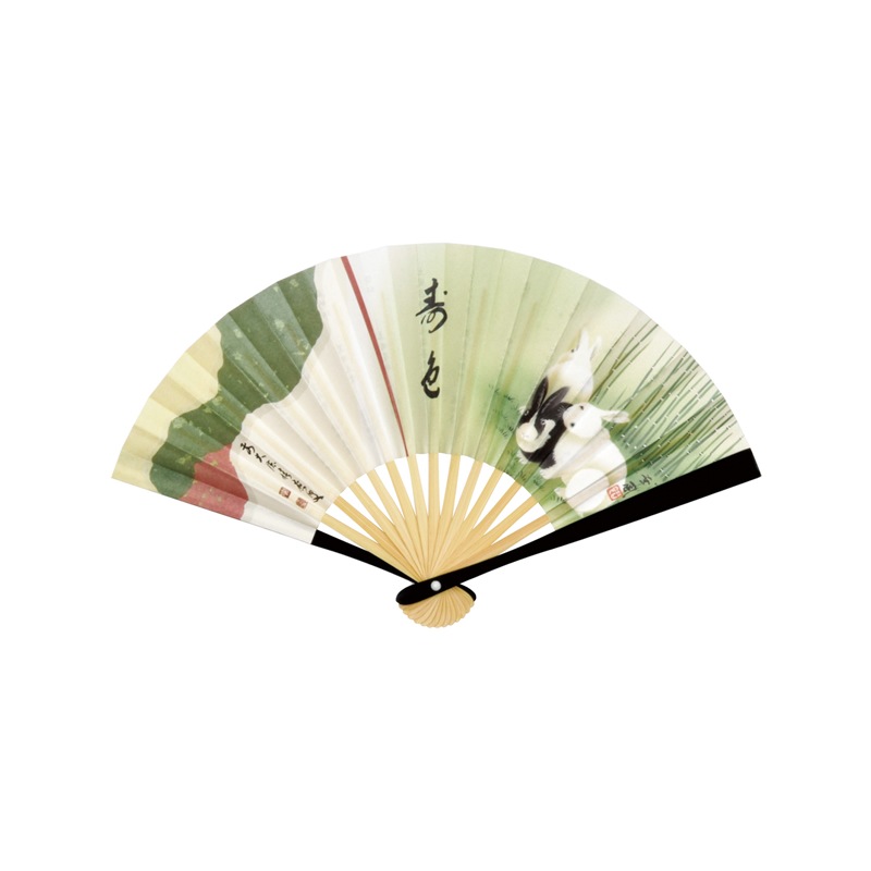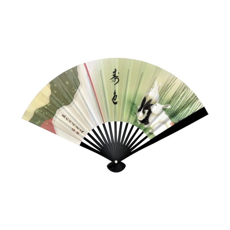 干支扇子 6寸 黒塗 木賊に三つ兎 積應師墨蹟写「寿色」 曽根幸風画 裏面:千家十職 (メール便対応商品)