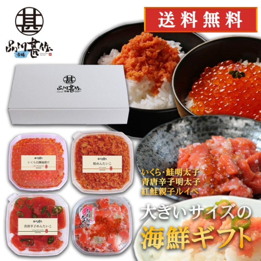 【送料無料】品川甚作商店の海鮮ギフト いくら170g 鮭明太子180g 青唐辛子明太子250g 紅鮭親子ルイベ180g 各1個
