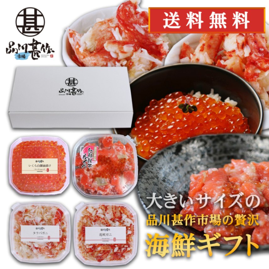 【送料無料】品川甚作商店の贅沢海鮮ギフト タラバガニほぐし身180g 花咲ガニほぐし身180g いくら170g 紅鮭親子ルイベ18...