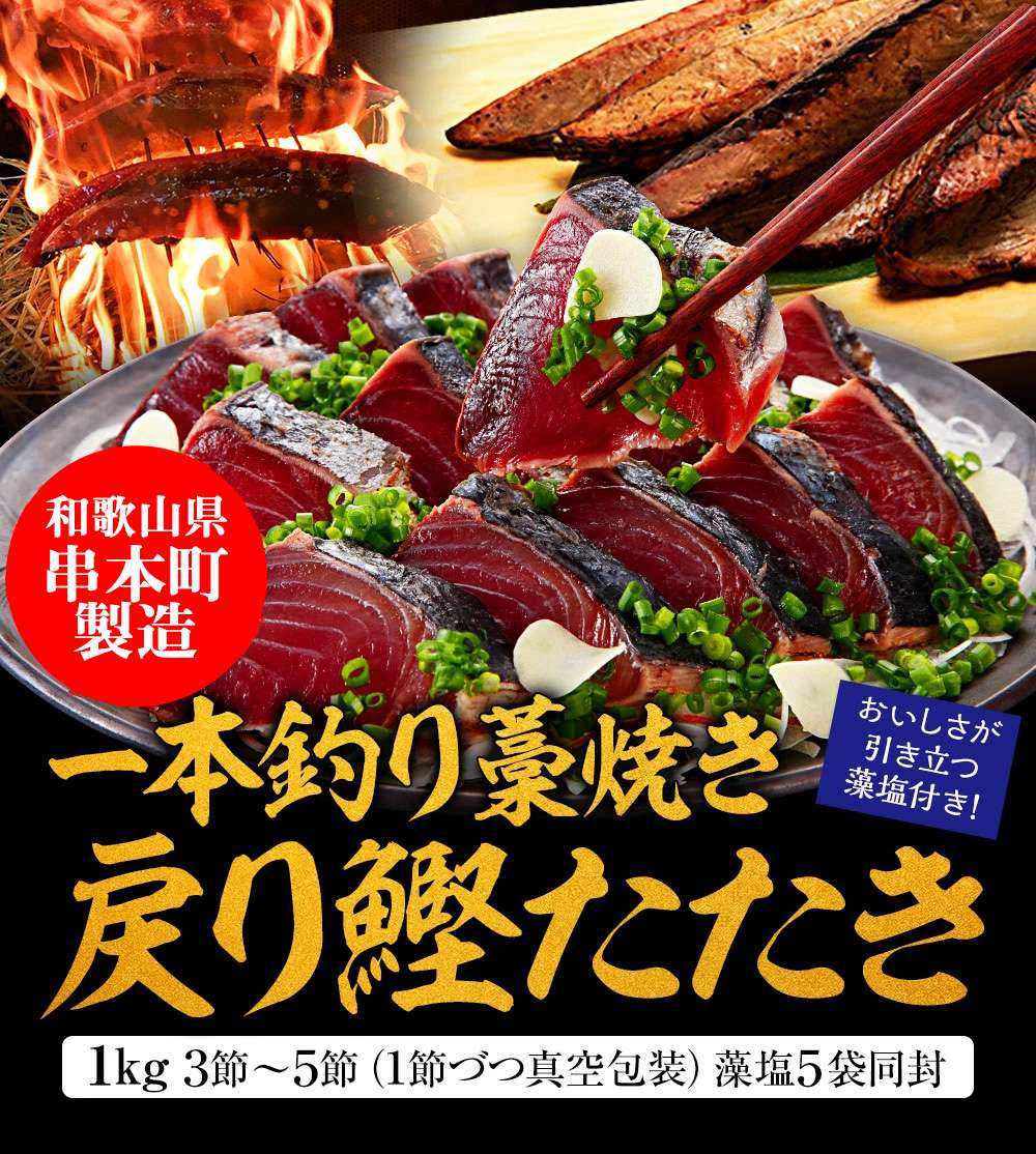 串本町製造 一本釣り藁焼き戻り鰹タタキ1kg 3節~5節(1節づつ真空包装)藻塩5袋同封 冷凍便送料無料(一部地域を除く) かつお...