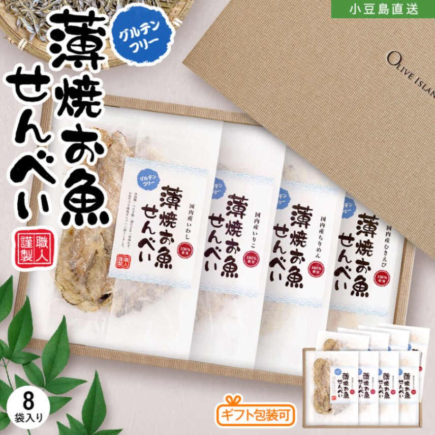 【専用ギフト箱入り】小豆島ファクトリー 薄焼お魚せんべい 食べ比べ4種セット計8袋(いわし5g×2/ちりめん5g×2/いりこ5g×...