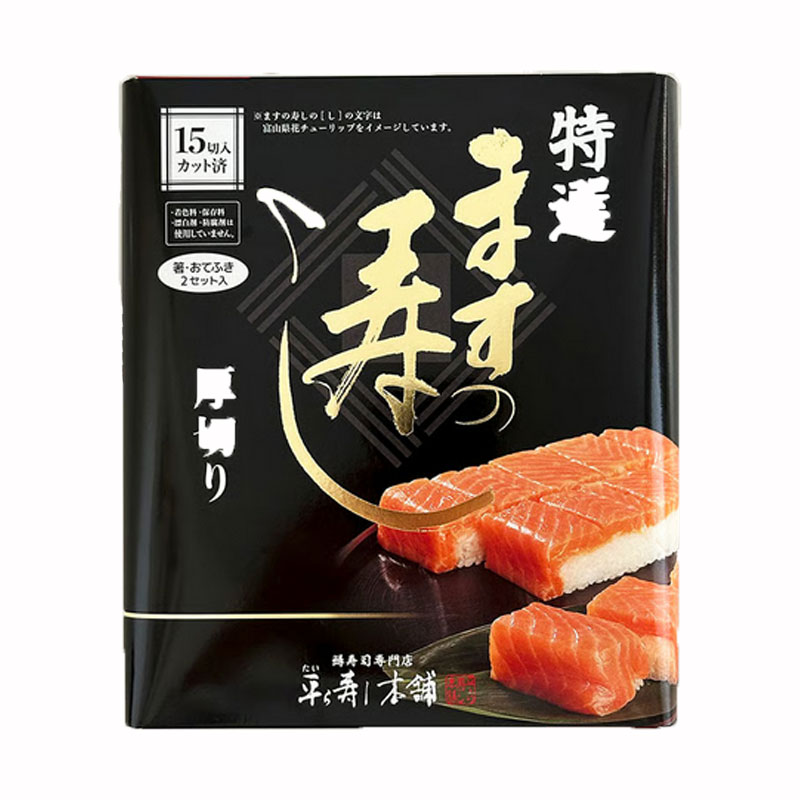 平ら寿し本舗:業界初の四角形「15切入厚切特選ますの寿し」