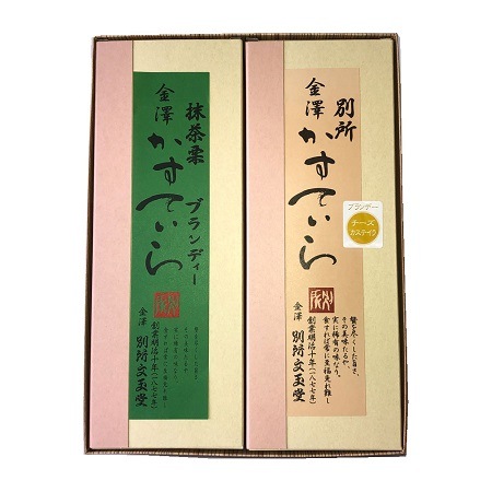 別所文玉堂「抹茶栗かすていら(ブランデー入)・チーズかすていら(ブランデー入)」(ロング2本セット)