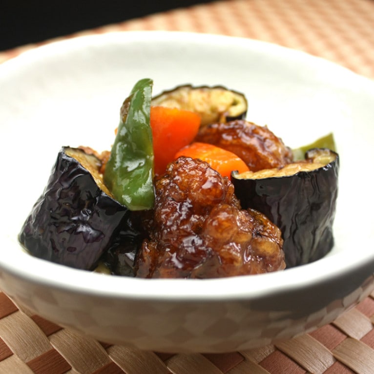 化学調味料無添加!【電子レンジで温めるだけ】 鶏肉と茄子のピリ辛炒め (ゴロゴロの野菜と鶏の唐揚げを特性だれで絡めました)