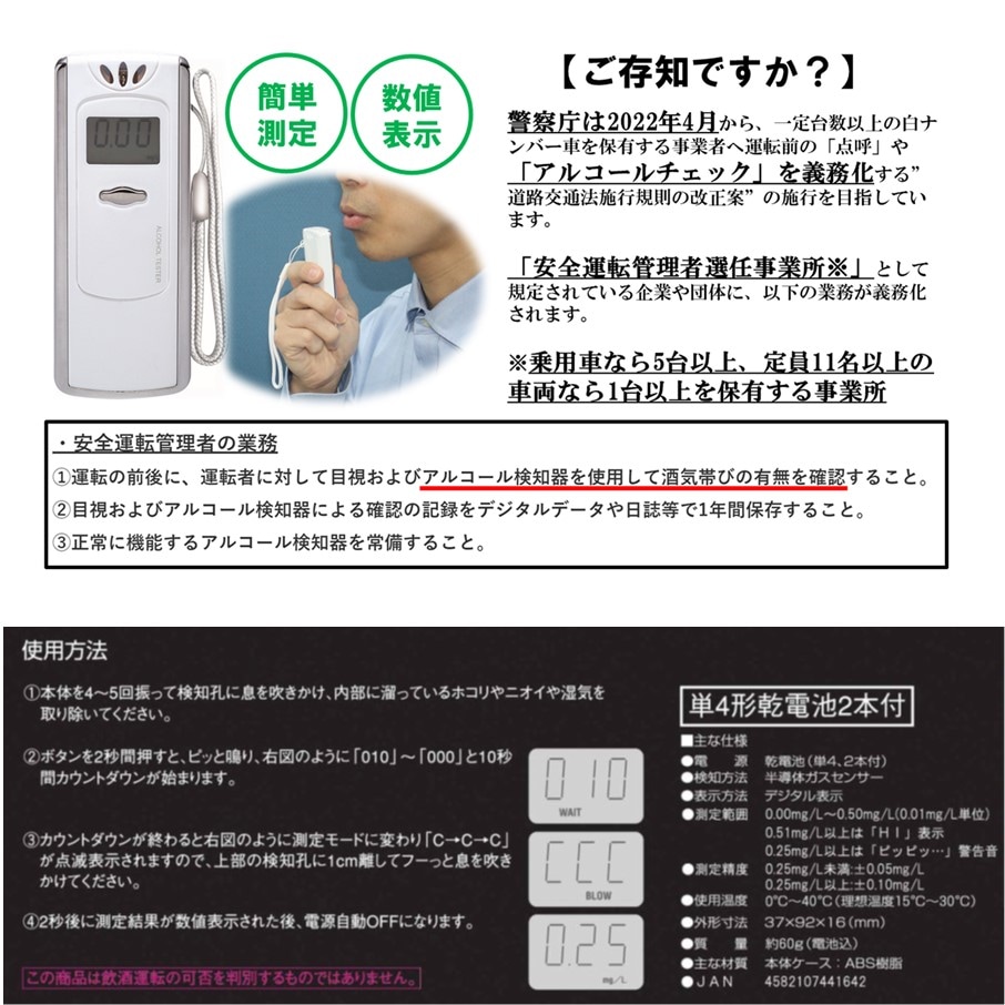 【アルコール検知器】アルコールチェッカー (日本基準対応)