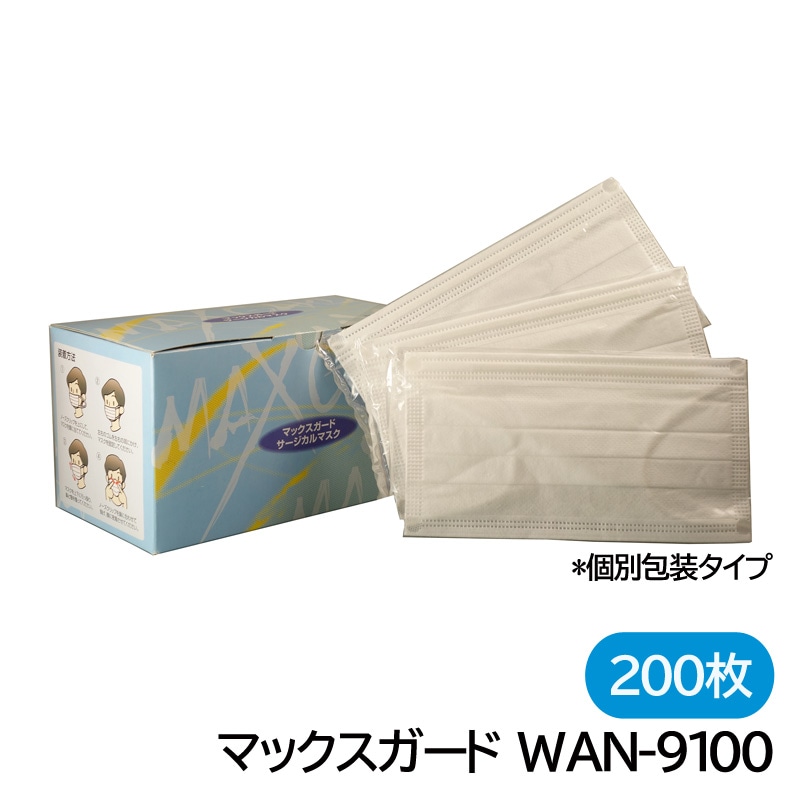【送料無料】(日本メーカー製)マックスガード サージカルマスク WAN-9100 個包装タイプ 200枚 (50枚入×4箱) 【粉...