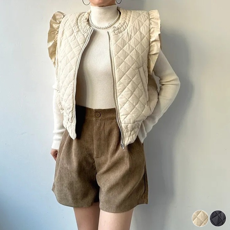 ダイヤ 切り替え キルティング フリル袖 ベスト