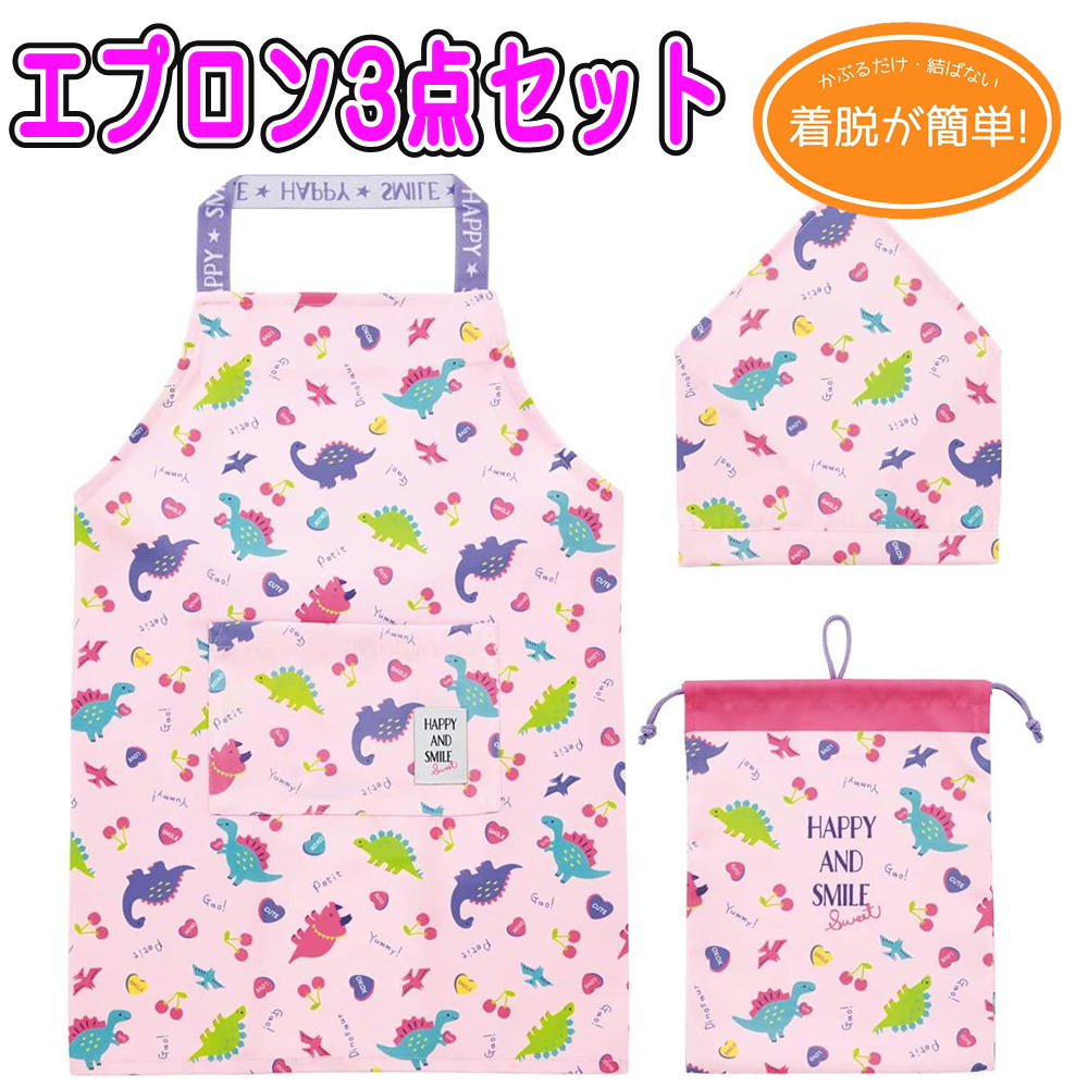 3点セット ハッピースマイル 子供 エプロン 女の子 三角巾 巾着 スケーター 恐竜 KBEPS1 KBEPS2 園児用 小学生用...