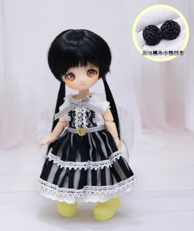 クリックポストOK 【4インチ】 耐熱 ドール用ウィッグ ふたつ結び (三つ編み)小物付 /ピュアブラック