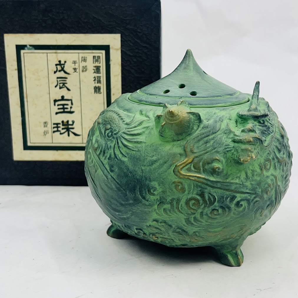 【中古】柿二庵 青銅色 陶器製 香炉 龍巻宝珠形香炉 香爐 宝寿雲龍図香炉