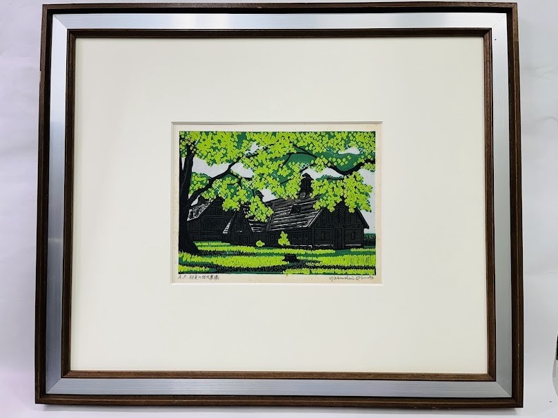 【中古】大本靖作 木版画 初夏の北大農場 AP アーティストプルーフ 幅20*高14.5センチ