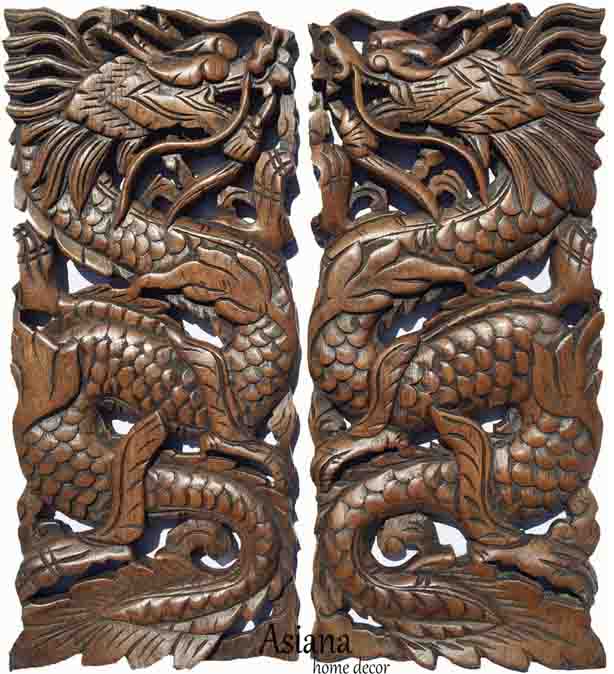 幸運の ラッキーチャイニーズ・ドラゴン壁彫刻 風水龍彫刻 木製壁パネル2個セット壁装イテリア 中華料理専門店 輸入品