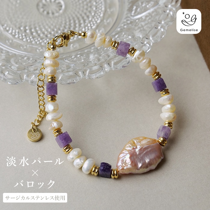ストーンブレスレット アメジスト 淡水パール 約16.5cm SUS316 サージカルステンレス 750307
