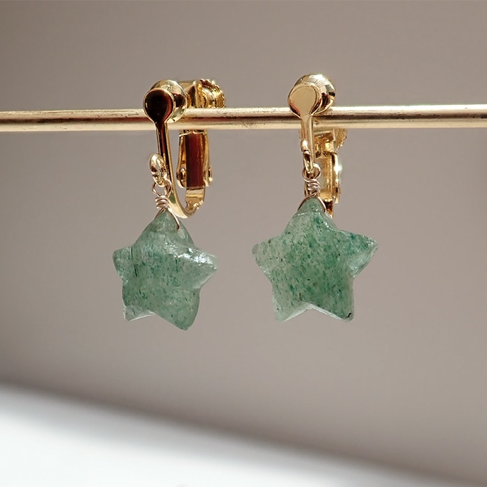 金属アレルギー対応 ステンレス イヤリング グリーンストロベリークォーツ 日本製 星カット 2個(1ペア) ゴールド ネジ式 ねじ...