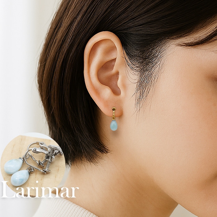 ラリマー ドロップ ルース ネジバネ式 イヤリング 天然石 ドミニカ産 日本製 ピアス穴不要 癒し 青石 プレゼント ギフト ハン...