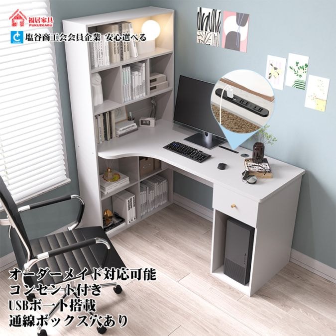 福居家具 自社産 法人様向け オフィスデスク PCデスク パソコンデスク 学習机 ワークデスク 収納棚付き L字型天板 R仕上げ ...