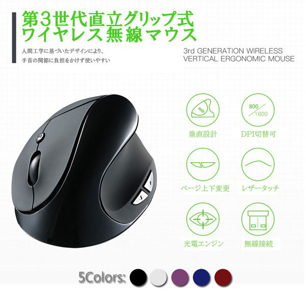 垂直 マウス ワイヤレス 無線 静音 光学式 右利き用 マウス 人間工学 腱鞘炎防止 リモートワーク